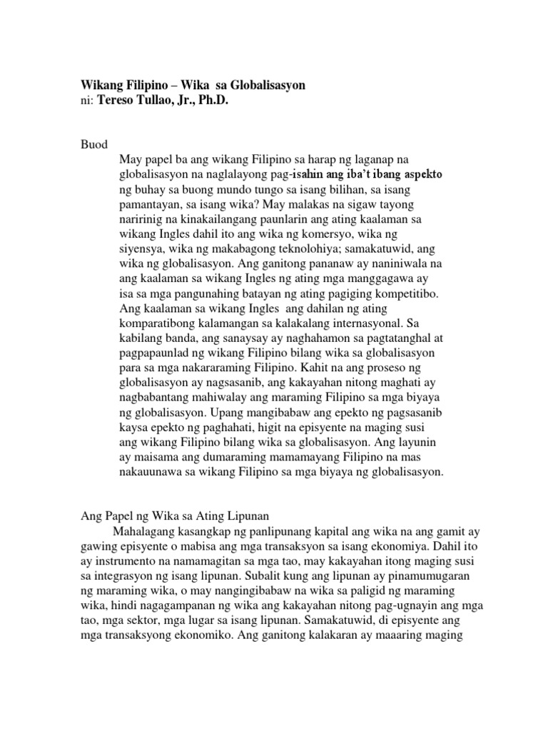 Wikang Filipino Wika Sa Globalisasyon Pdf
