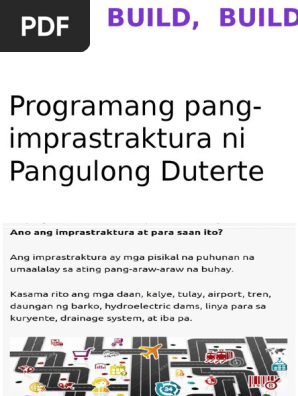 Click to expand document information. 25 minutes ago by. Programang pang- imprastraktura Ang imprastraktura ay tumutukoy sa mga estrukturang mahalaga sa pag-unlad ng bansa tulad ng mga kalsada tulay riles ng tren paliparan at daungan ng mga barko.