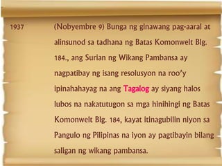 Features Case Studies. 184 na lumilikha ng isang Surian ng Wikang Pambansa at itinakda ang mga. 1936 Nobyembre 13 Pinagtibay ng Batasang Pambansa ang Batas Komonwelt Blg.