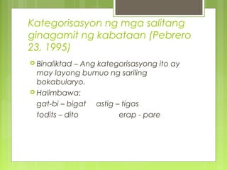 Lalawiganin na salita kahulugan at halimbawa. Salitang matalino April 20 2021. 1 istokwa o naglayas 2 parak o pulis 3 tiboli o tomboy 4 eskapo o takas 5 balbonik o maraming balahibo. Ang mga hiram na salita ay mga salitang bahagi ng wikang Filipino na kinuha sa wikang dayuhan katulad lamang ng Ingles Kastila at iba pa.