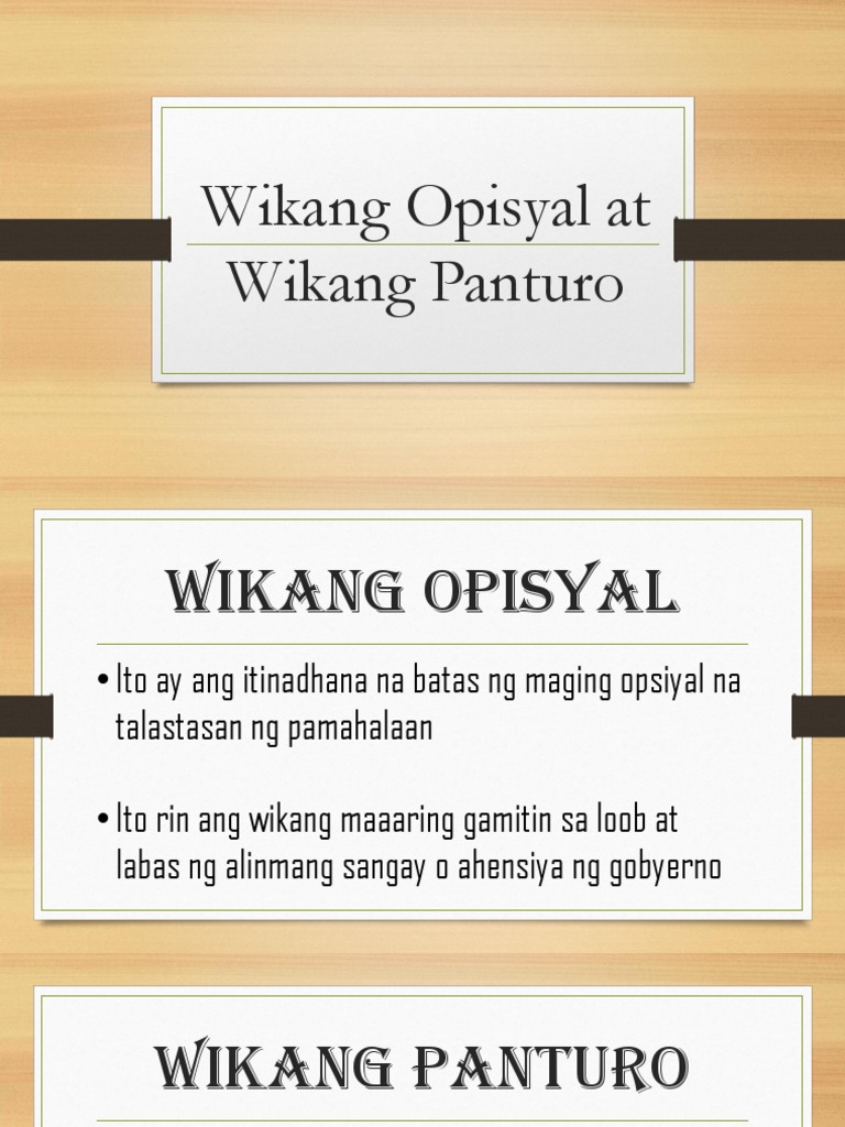 WIKANG OPISYAL AT WIKANG PANTURO Ang wikang opisyal ay nangangahulugang ito ay ang itinadhana ng batas upang maging wika sa mga opisyal na talastasan ng pamahalaan. Filipino111 Wika Wikang Pambansa Wikang Panturo at Wikang Opisyal Ang. Ang wikang pambansa ay isang wika na natatanging kinakatawan ang pambansang pagkilanlan ng ating lahi at bansa.